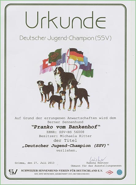 FCI-Gruppe 2 – 2. Platz Am 29.06.2014 wurde ich erfolgreich in Baden-Baden/Steinbach angekört. Nun darf ich mich offiziell Deckrüde im SSV nennen. |